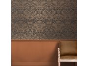 Vliesová tapeta s vinylovým povrchem a bohatým ornamentálním vzorem v bronzovo-hnědých odstínech se zlatým odleskem. Podklad je vzor šedo-černého štuku.