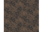Černá strukturovaná vliesová tapeta na zeď, imitace štukové omítky, dekor listů a květiny v odstínech šedé a bronzové.