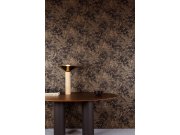 . Jemně strukturovaná vliesová tapeta na zeď, odstíny šedé a černé, na listech zlaté a bronzové linie.