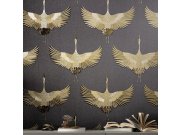 Vliesová tapeta s vinylovým povrchem, podklad hrubší černá textilní struktura, hnědo-zlatý motiv letících volavek vzor evokuje výšivku. Co vás zaujme: efektní vzor, vysoká odolnost a omyvatelnost. Design: přírodní, luxusní. Úroveň tapetování: pro začátečn