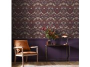 Vliesová tapeta na zeď, bohatý ornamentální vzor s květinami, listy, ptáčky a jahodami, odstíny fialové, cihlově červené, hnědé a šedé. Co u vás zaujme: kolekce vytvořená ikonou světového designu. Design: nadčasový, přírodní. Úroveň tapetování: pro začáte
