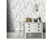 Moderní trojúhelníková mozaika v odstínech šedé a béžové na bílé vliesové tapetě.
