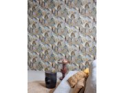 Vliesová tapeta na zed, motiv exotických ptáků mezi květinami a větvičkami stromů, pololesklý modrý podklad, hnědo-béžový a černý vzor, vláknitá textura. Co vás zaujme: vyrobeno s ohledem na udržitelnost a ekologii. Design: nadčasový, přírodní. Úroveň tap