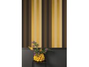 Vliesová tapeta na zeď, pruhy v odstínech hnědé, černé, okrové a zlaté, mat, pololesk. Pruhy cca 6,8cm. Co vás zaujme: vyrobeno s ohledem na udržitelnost a ekologii. Design: grafický. Úroveň tapetování: pro začátečníky. Země původu: Belgie.