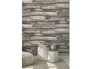Vliesová tapeta s vinylovým povrchem, imitace dřeva, dřevěných palubek, obložení, lamel, mírně plastická textura, odstíny hnědé, béžové a šedo-béžové. Šířka lamely cca 3,5cm a 1cm. Co vás zaujme: 3D efekt, vysoká odolnost a omyvatelnost. Design: rustikáln