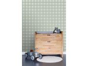 Geometrický vzor, design hrubé textilie s jemně plastickou nepravidelnou texturou v odstínech zelené. Podklad vlies, povrch vinyl.