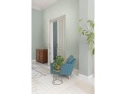 Vliesová, modro-zelená tapeta s šedo-stříbrnými detaily a metalickým pololeskem.