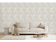 Luxusní béžovo-šedá vliesová tapeta s vinylovým povrchem, motivy listů tropických rostlin, odstíny béžové a šedé, látková textura. Foto interiéru je pouze ilustrační - odlišné barvy.