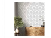 Luxusní vliesová tapeta s vinylovým povrchem, pololesklý šedo-béžový podklad, stříbrný zámecký vzor. Foto interiéru je pouze ilustrační - odlišné barvy. Co vás zaujme: textura, kvalita zpracování, šíře role. Design: klasický, nadčasový. Úroveň tapetování:
