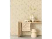 Krémová vliesová tapeta na zeď, netradiční zlatý květinový vzor inspirovaný africkou batikou. Co vás zaujme: vyrobeno s ohledem na udržitelnost a ekologii. Design: přírodní, etno. Úroveň tapetování: začátečník. Země původu: Holandsko.
