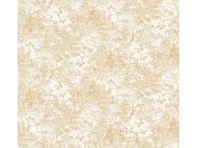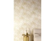 Luxusní vliesová tapeta s vinylovým povrchem s neobvyklým vzorem - plastické vlnky a lístky v béžovém odstínu se stříbrným a zlatým vzorem větviček s květinami a lístky.