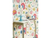 Pestrý květinový vzor na bílé vliesové tapetě.