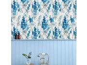 Vliesová tapeta s květinovým motivem v modré barvě na bílém hladkém podkladu vnese do interiéru příjemnou atmosféru.