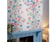 Vliesová tapeta s květinovým motivem v modré a růžové barvě na bílém hladkém podkladu vnese do interiéru příjemnou atmosféru.