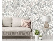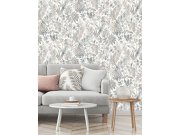 Exotika ve vintage stylu. Hladká textura, podklad krémový, částečně setřený vzor, papoušci a tukani, v odstínech šedé a hnědé.