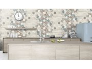 Efektní, netradiční spojení keramické mozaiky s přírodním dřevem. Dřevo v odstínech šedé, mozaika odstíny tyrkysové, šedé a pololesklé hnědo-bronzové.