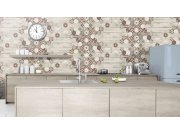Efektní, netradiční spojení keramické mozaiky s přírodním dřevem. Dřevo v odstínech šedo-béžové, mozaika odstíny hnědé, červené a pololesklé hnědo-bronzové.
