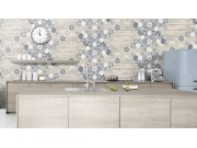 Efektní, netradiční spojení keramické mozaiky s přírodním dřevem. Dřevo v odstínech šedo-béžové, mozaika odstíny modré, šedé, světle modrá metalický pololesk.