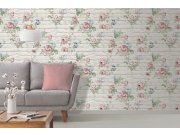 Vliesová tapeta s vinylovým povrchem. Skvělé netradiční spojení něžného romantického květinového vzoru a cihlové stěny. Cihly v šedo-béžových odstínech, vzor zelená, růžová, modrá. Kombinujte se souvisejícími tapetami.