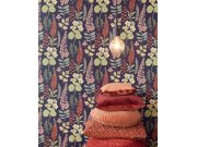 Rostlinné motivy představují moderní trend v oblasti bydlení. Listy a květiny v růžových, cihlových, béžových a zelených odstínech na tmavě modré vliesové tapetě na zeď.