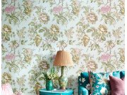 Luxusní vliesová tapeta s vinylovým povrchem, světle modrý/tyrkysový podklad s látkovou texturou, květinový motiv v odstínech zelené, béžové a lila. Co vás zaujme: kvalita zpracování, odolnost. Design: přírodní, romantický. Úroveň tapetování: pro začátečn