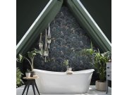 Luxusní vliesová tapeta s exotickými rostlinami v pestrých barvách na tmavě modrém podkladu.