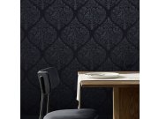 Luxusní tmavě modrá vliesová tapeta s flockovými ornamenty.