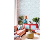 Luxusní vliesová tapeta na zeď s vinylovým povrchem a geometrickým obrazcem v modré a světle modré barvě. Foto interiéru je pouze ilustrační - odlišné barvy.