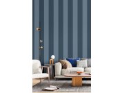Luxusní geometrická vliesová tapeta s vinylovým povrchem, výrazně plastické proužky, modrá s kovovým leskem.