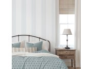 Matná vliesová pruhovaná tapeta na zeď, odstíny modré, bílé a šedé. Foto interiéru je pouze ilustrační - odlišné barvy.