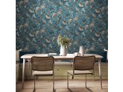 Vliesová tapeta na zed, motiv exotických ptáků mezi květinami a větvičkami stromů, pololesklý modrý podklad, hnědo-béžový a černý vzor, vláknitá textura. Co vás zaujme: vyrobeno s ohledem na udržitelnost a ekologii. Design: nadčasový, přírodní. Úroveň tap