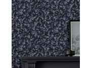 Modro-šedá vliesová tapeta na zeď, motiv divoké přírody - stromy, listy, květiny.