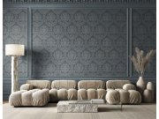 Vliesova tapeta metalická šedo-modrá, ornamenty metalická modrá.