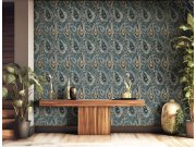 Vliesová tapeta s vinylovým povrchem, tyrkysový podklad, ornamentální vzory v odstínech šedé, šedo-modré a okrově zlaté, látková textura. Co vás zaujme: vysoká odolnost a omyvatelnost, kvalita zpracování. Design: nadčasový, klasický. Úroveň tapetování: pr