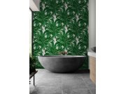 Vliesová tapeta s motivem velkých zelených listů palem na světle šedém žíhaném podkladu.