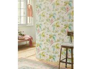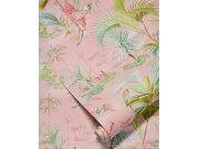 Vliesová tapeta s hladkou texturou. Podklad růžový, design s ptáky, palmami, listy a exotickými květinami.
