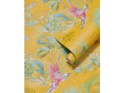 Vliesová tapeta s hladkou texturou. Podklad okrový, design s ptáky, palmami, listy a exotickými květinami.