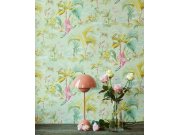 Vliesová tapeta s hladkou texturou. Podklad světle zelený, design s ptáky, palmami, listy a exotickými květinami.