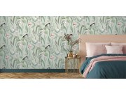 MOMENTÁLNĚ NEDOSTUPNÁ, PŘEDPOKLÁDANÁ DOSTUPNOST ČERVEN 2025. Luxusní vliesová tapeta na zeď, pololesklý šedo-zelený podklad, motiv leknínů a ptáků v odstínech hnědé, červené, šedé a zelené. Vzory na tapetě působí jako výšivka.
