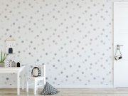 Vliesová, bílá tapeta s šedými a stříbrnými puntíky.