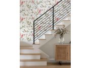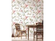 Vliesová květinová tapeta na zeď, rozkvetlé větvičky v odstínech zelené, červené a lososové, bílý podklad.