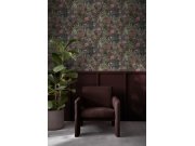 Tmavě modrá vliesová tapeta na zeď, květinový vzor v zelené, starorůžové, hnědé a okrové.