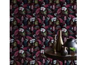 Luxusní květinová vliesová tapeta s vinylovým povrchem v pestrých barvách s metalickými odlesky. Motiv tropických květin a motýlů. Hrubá struktura.