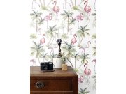 Vliesová tapeta bílá, s růžovými plameňáky a palmami.