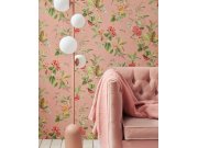 Vlisová tapeta s jemně plastickou texturou. Velké květiny, rostliny a ptáci. Podklad je růžový, s drobným vzorkem "sluníček".