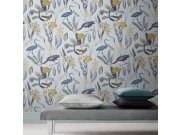 Luxusní vliesová tapeta s motivem volavek, listů, květů v zelených, modrých, fialových a béžových odstínech na světle modrém hladkém podkladu.