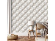 Luxusní geometrická vliesová tapeta s vinylovým povrchem, efektní střídání plastických textur, odstíny šedo-béžové. Foto interiéru je pouze ilustrační - odlišné barvy.