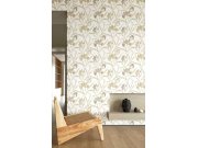 Luxusní krémová vliesová tapeta s vinylovým povrchem, efekt jemné textilie s rozkvetlými větvičkami v odstínech zlato-béžové a šedé.