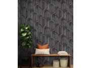 Luxusní plastická černá vliesová tapeta s vinylovým povrchem, motivy větviček a listů v odstínech šedé, pololesklé zlaté a bronzové; hrubší textura.