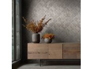 Vliesová tapeta s vinylovým povrchem, grafický vzor, odstíny šedé, šedo-modré a hnědé, jemná látková textura. Foto interiéru je pouze ilustrační - odlišné barvy. Co vás zaujme: vysoká odolnost, propracované detaily. Design: grafický, luxusní. Úroveň tapet
